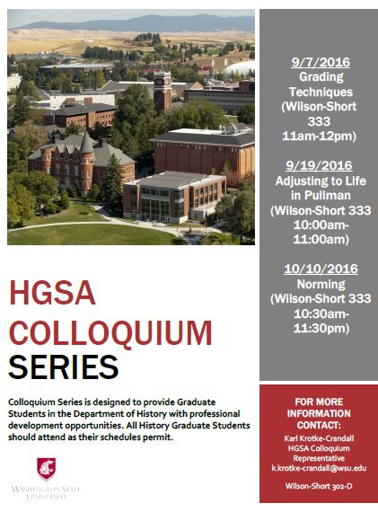 The History Graduate Student Association is busy this fall sponsoring informative colloquiums. The next event will be October 10. Read the flyer for contact information and previous months’ colloquiums.