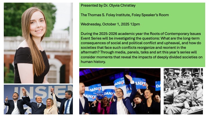 RCI and The Thomas S. Foley Institute hosted Dr. Olyvia Christley of WSU for a talk and discussion of the motivations, methods, and aspirations of far-right political parties in Europe over the last forty years. Dr. Christley spoke to both the RCI’s interest in the implications of periods of social and political conflict and the Foley Institute’s theme for 2025-2026 on the fragility of democracy.